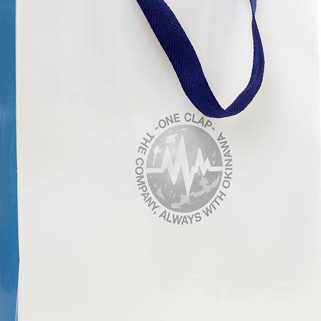両サイドの横マチはコーポレートカラーのブルーでベタ印刷し、会社名も白い文字でデザインが配置されています。