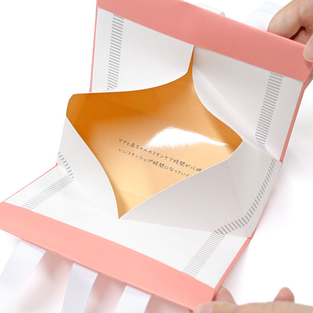 出産祝いや、お子様の誕生日プレゼント用スキンケア用品の特別なプレゼントにふさわしい、上品な《ハコぶくろ》に仕上がりました。