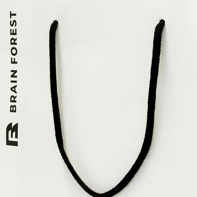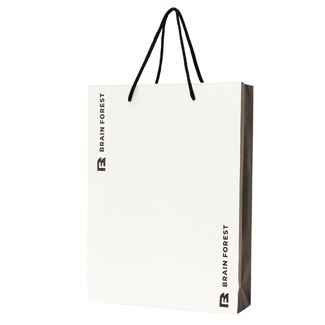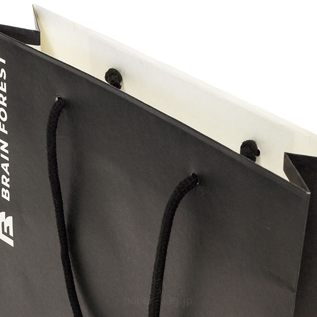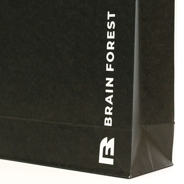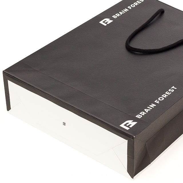 紙袋の正面と両方サイドマチを黒色でベタ印刷し、背面側は用紙の白さを活かしたモノトーンデザインです。
