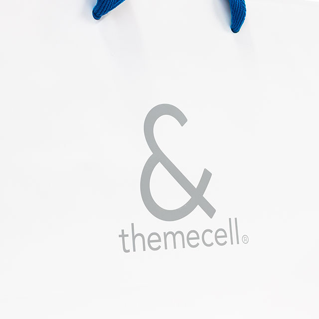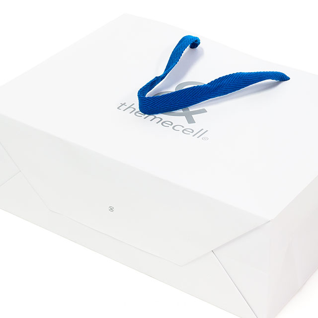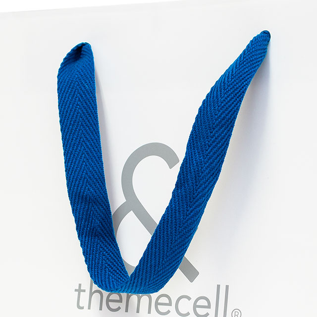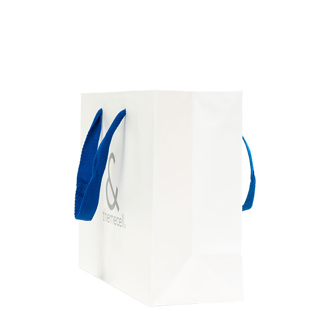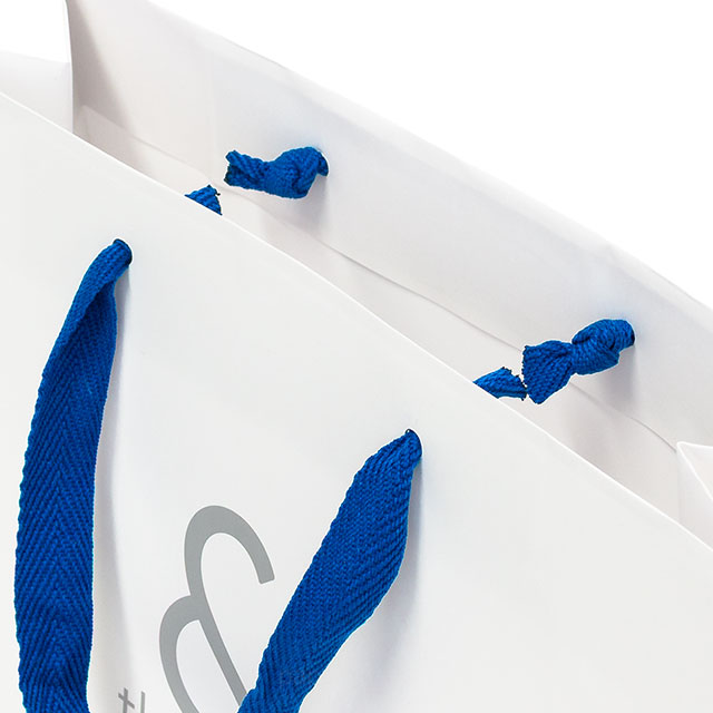 白地の紙袋に青いハンドルがアクセントになった、すっきりとおしゃれなオリジナル紙袋に仕上がりました。