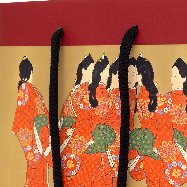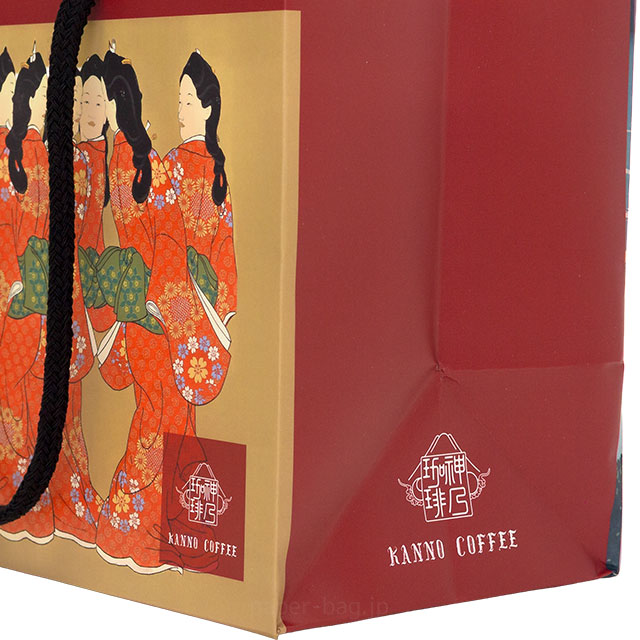両正面には日本画デザインのみを大きく印刷し、紙袋を開いた時に見える横マチには店舗名をデザインしています。