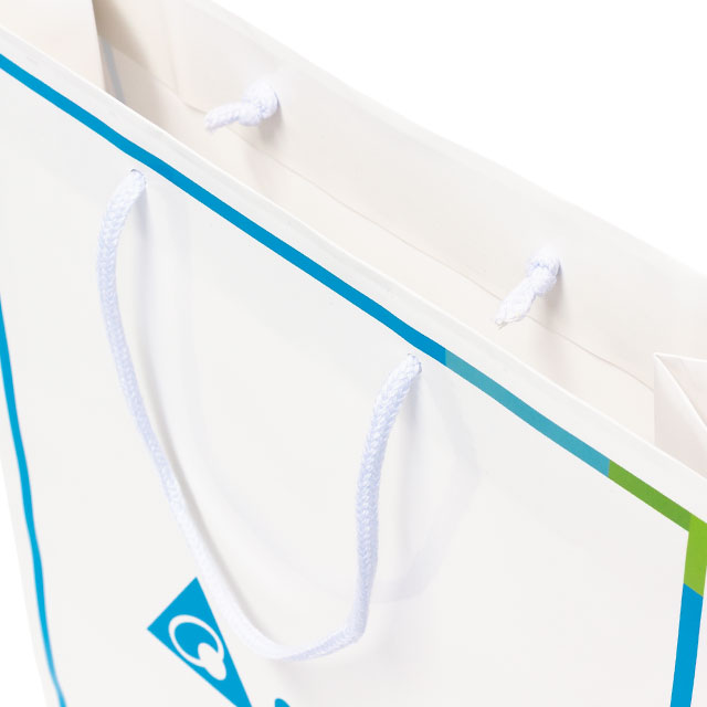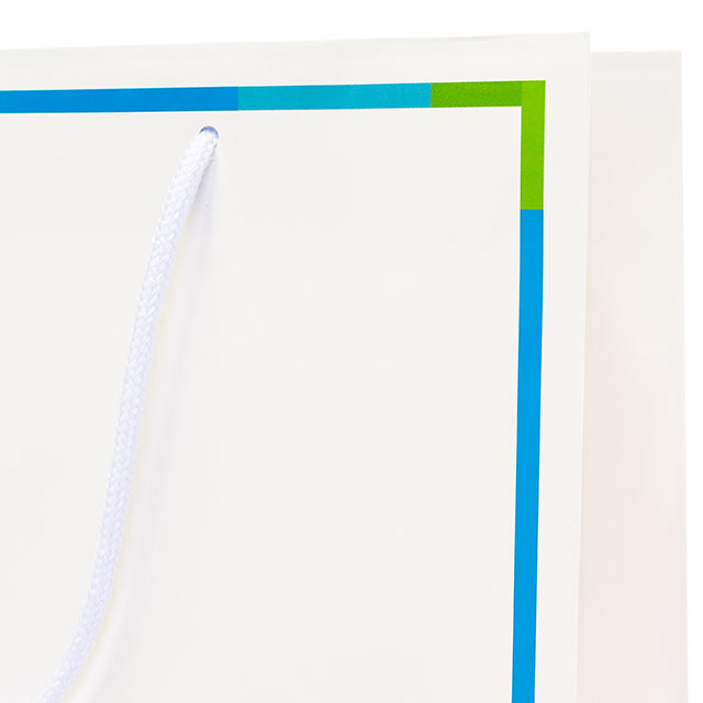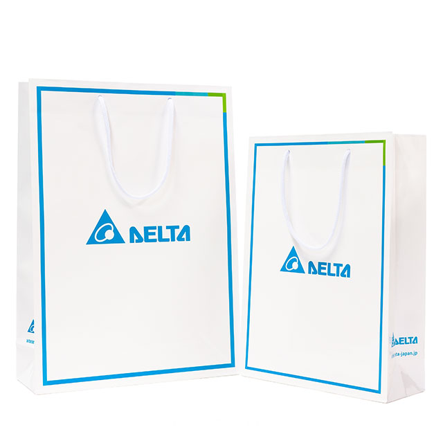 デザインはフルカラー印刷で、紙袋中央にロゴ+枠付きデザインのほか、横マチにもロゴと企業サイトURLが印刷されています。