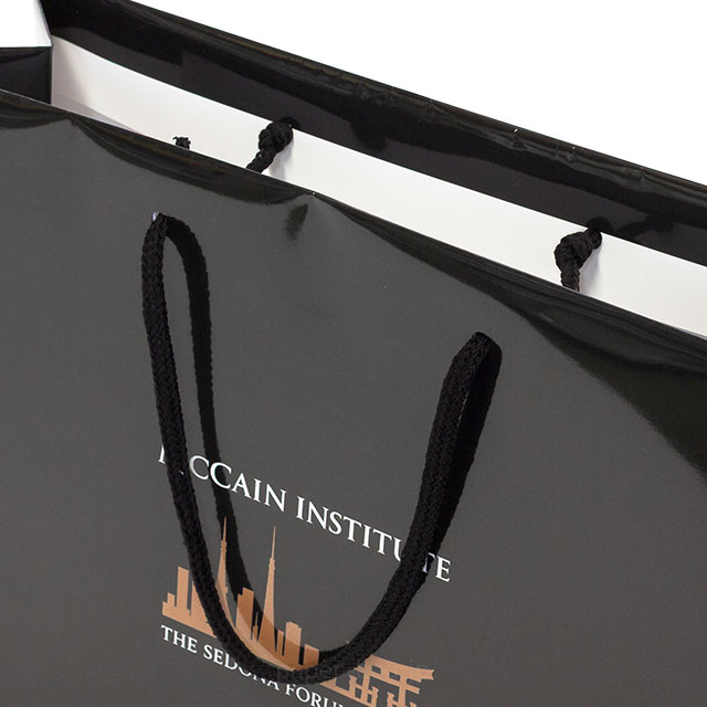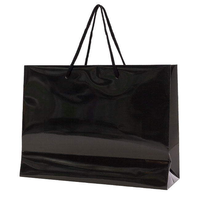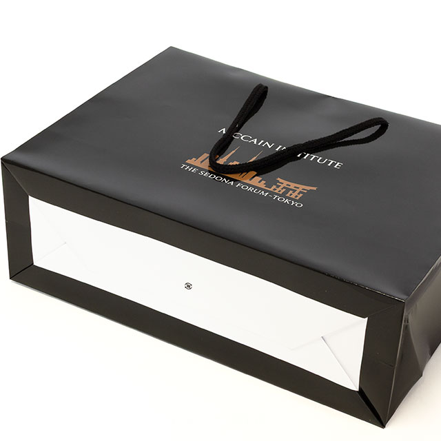 コート紙そのものは白色ですが、用紙全体を黒ベースのデザインで全面印刷することで、黒い紙袋としてデザインされています。