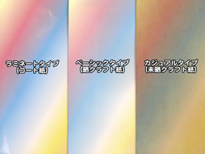 こちらはすべて同じ色で印刷していますが、紙の色が白の「コート紙」「晒クラフト紙」に比べて「未晒クラフト紙」ではかなり沈んでいるのが分かります。中でも特に白が難しく、沈んでベージュ色になってしまいます。