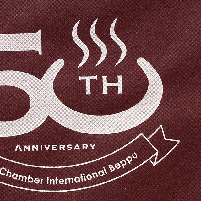 ボルドーの生地色に、白色でアニバーサリーロゴをシルク印刷しました。