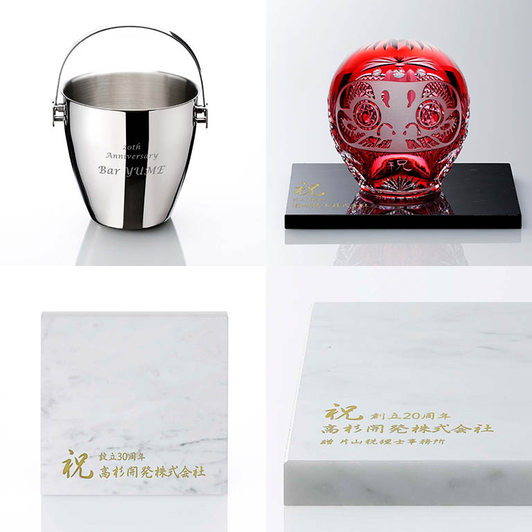グラス等の食器類の他、オブジェ、コスメ、アウトドアグッズ、バーグッズなど、さまざまなアイテムに名入れ彫刻を施し、個人だけでなく法人向けの贈り物や記念品として多くの方に選ばれていらっしゃいます。